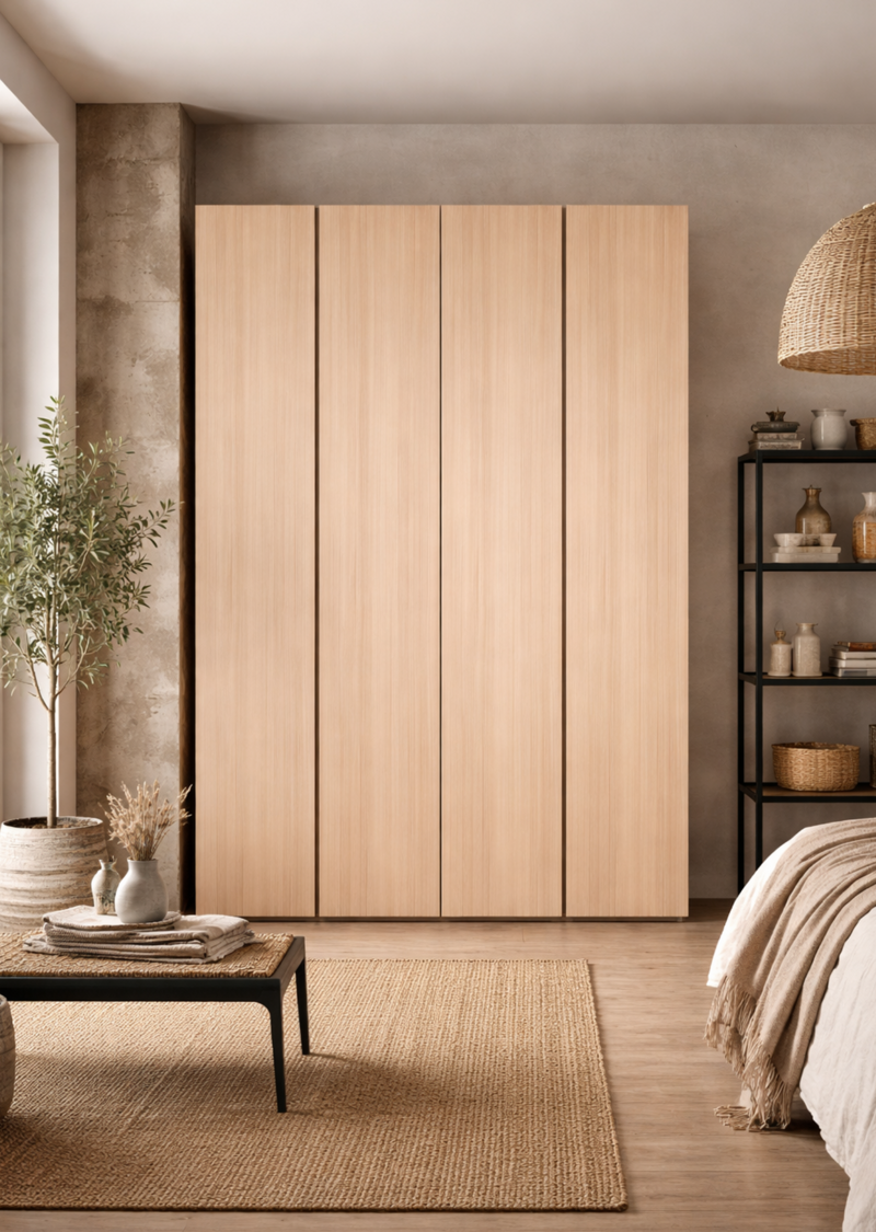 Arco è un armadio a 4 o 6 ante con apertura a gola e cassettiera interna a 3 cassetti. Le linee pulite e i materiali materici lo rendono la scelta ideale per ambienti caldi e funzionali. Disponibile in due tonalità naturali.