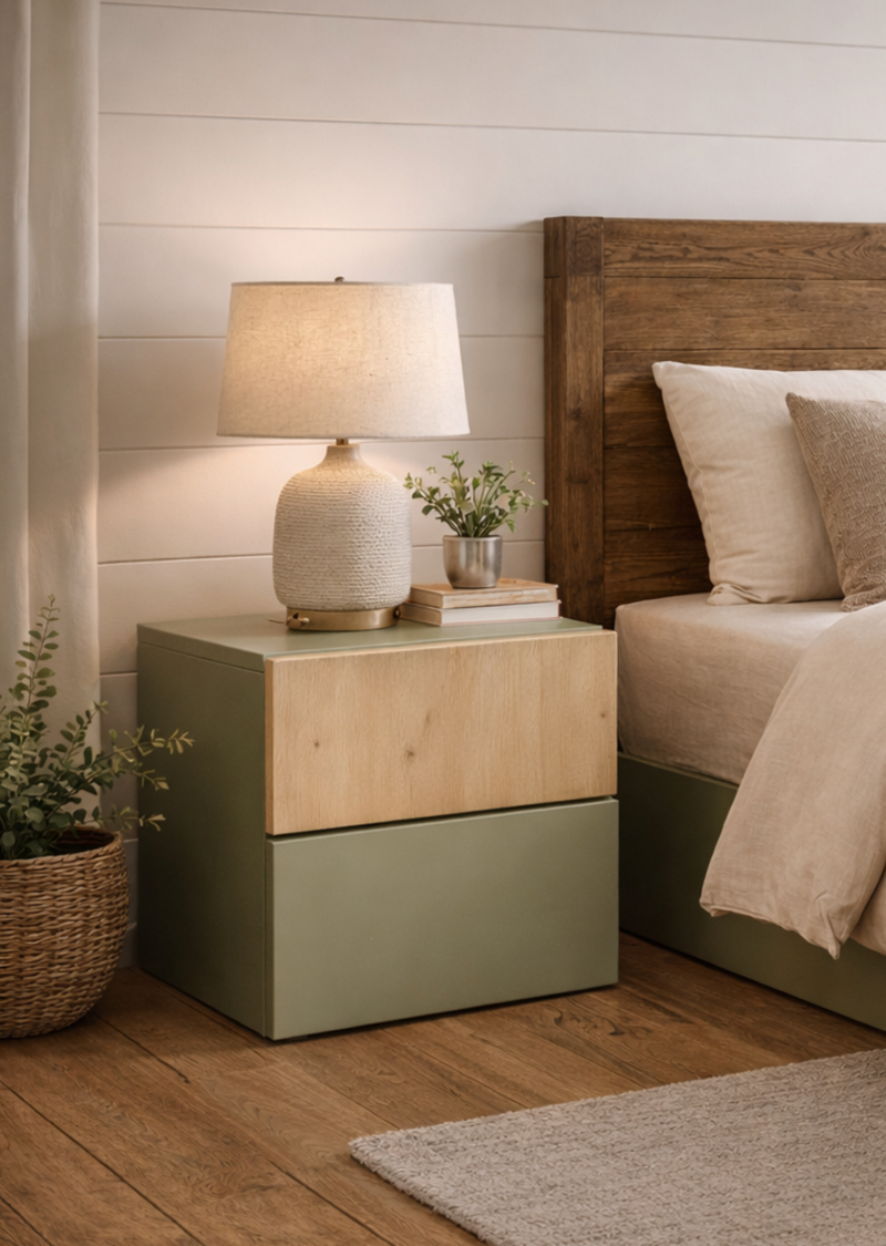 Aura è un comodino a 2 cassetti che riprende le finiture calde dell’armadio Arco. Con linee semplici e materiali naturali, è ideale per camere dallo stile rustico-contemporaneo. Disponibile in due tonalità coordinate.