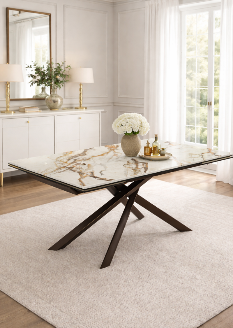 Tavolo allungabile con piano in ceramica effetto marmo, Bastioni abbina praticità e ricercatezza. Ideale per chi cerca un arredo trasformabile senza rinunciare allo stile, si adatta con naturalezza a momenti quotidiani e conviviali.