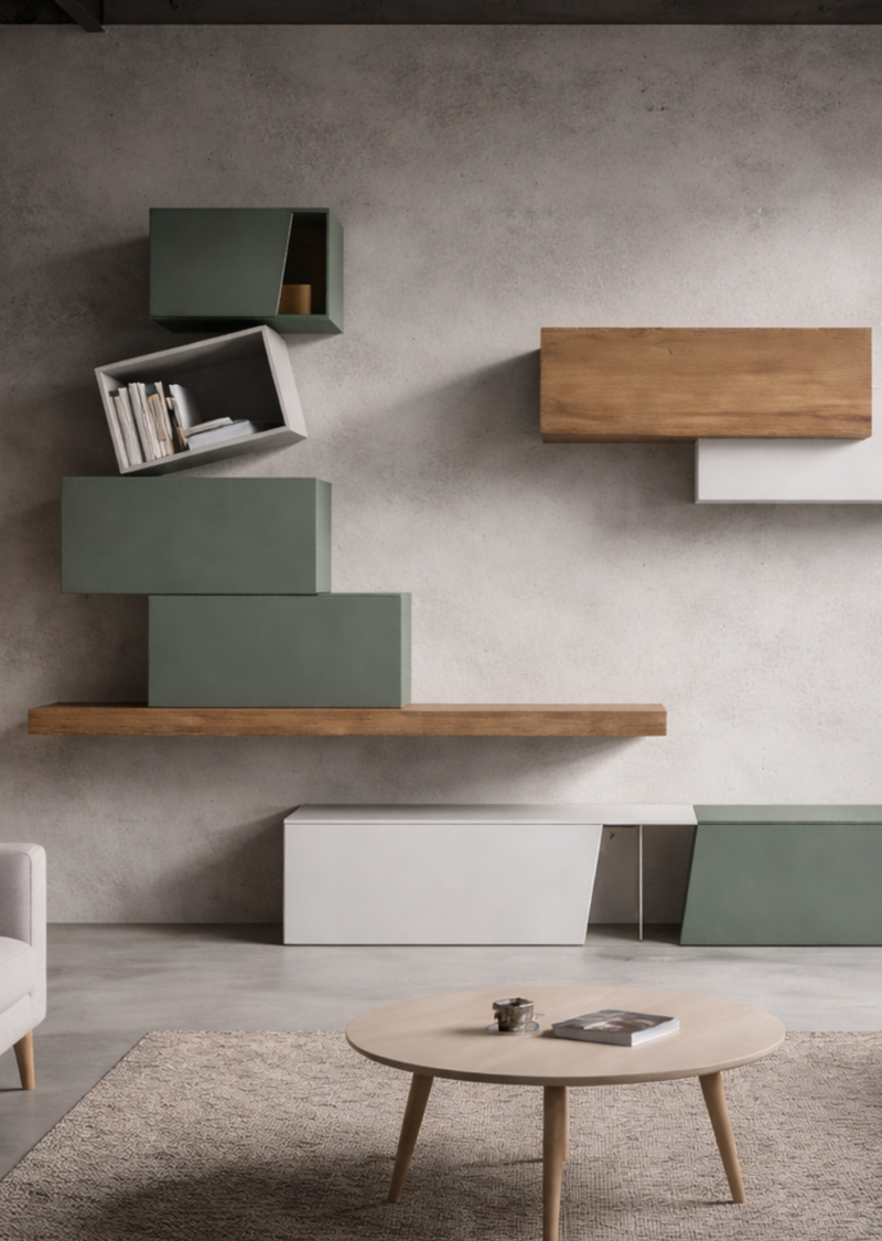 Bitta combina moduli in tre colori, con elementi sospesi sulla destra, base per TV e quattro moduli verticali a sinistra, uno dei quali inclinato. Una composizione creativa per soggiorni dal carattere deciso. Disponibile in due varianti.