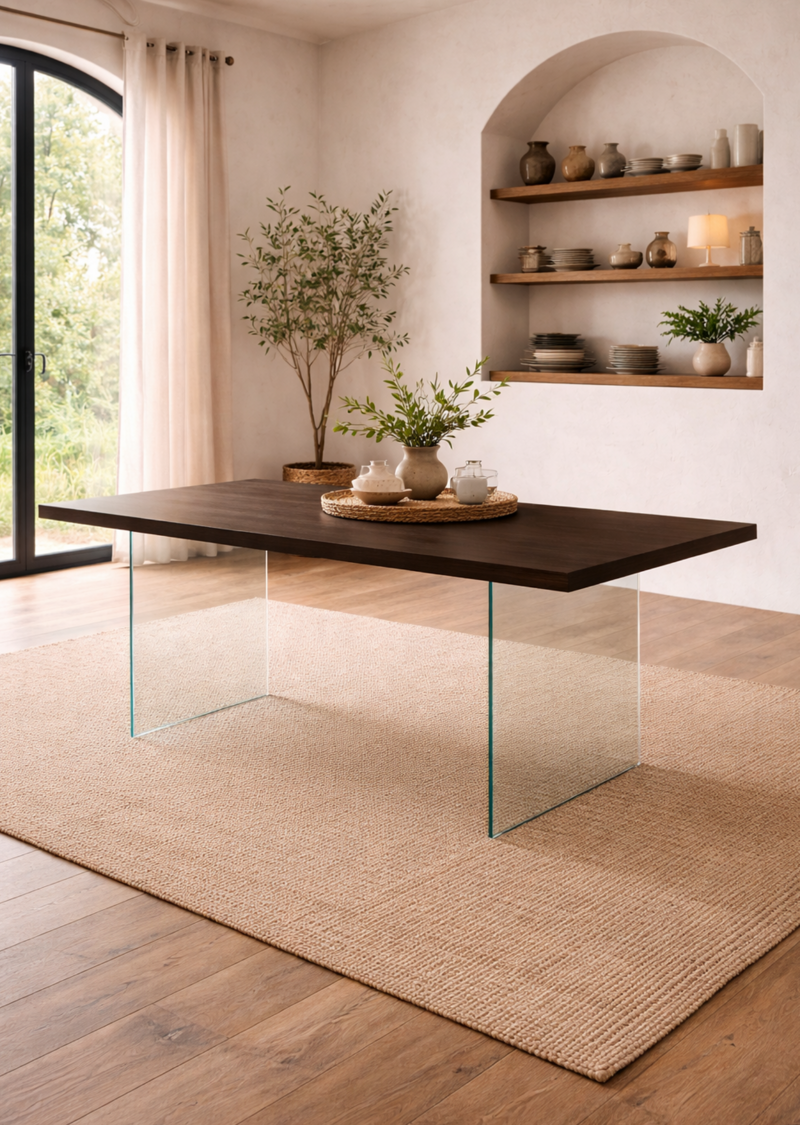Cedro è un tavolo allungabile con piano in rovere impiallacciato e gambe in vetro trasparente, che crea un effetto sospeso ed elegante. Raffinato e originale, dona luminosità ad ambienti moderni e accoglienti.