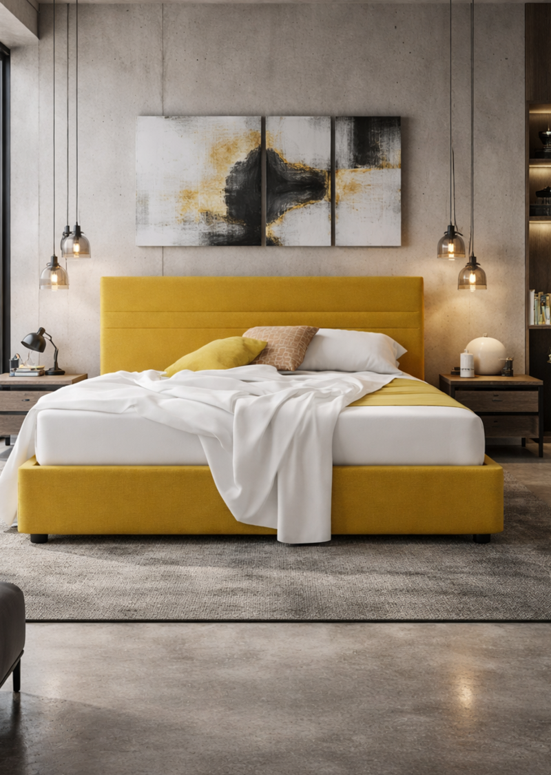 Letto contenitore in tessuto con testiera attrezzata con tasche portaoggetti: Darsena è pensato per ambienti dinamici e funzionali, con un tocco urbano, disponibile in due colori.