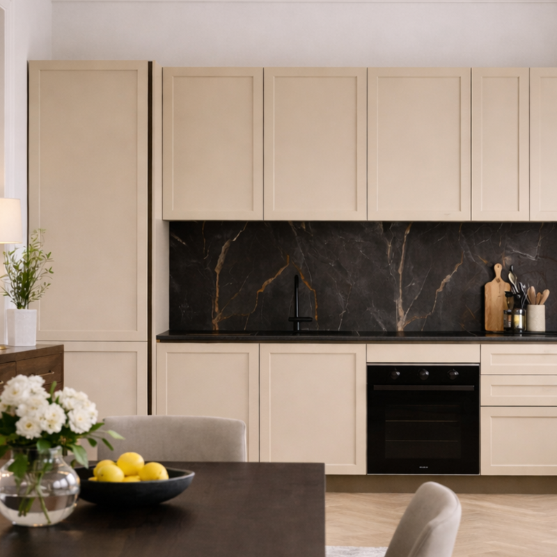 Indro è una cucina dal gusto classico-contemporaneo, con frontali eleganti e composizione armonica. Ideale per ambienti raffinati, offre soluzioni funzionali senza rinunciare allo stile. Disponibile nelle lunghezze 305 o 363 cm, con colonna frigo a destra o sinistra, elettrodomestici, lavello e miscelatore esclusi, disponibile in una sola colorazione.
