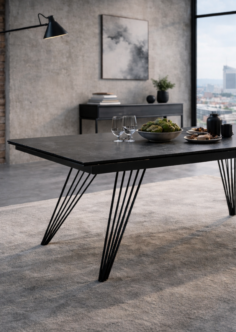 Top in ceramica effetto marmo e gambe in metallo per Pontile, tavolo allungabile dal look industrial chic. Unisce raffinatezza materica e robustezza strutturale, perfetto per spazi moderni e dinamici.