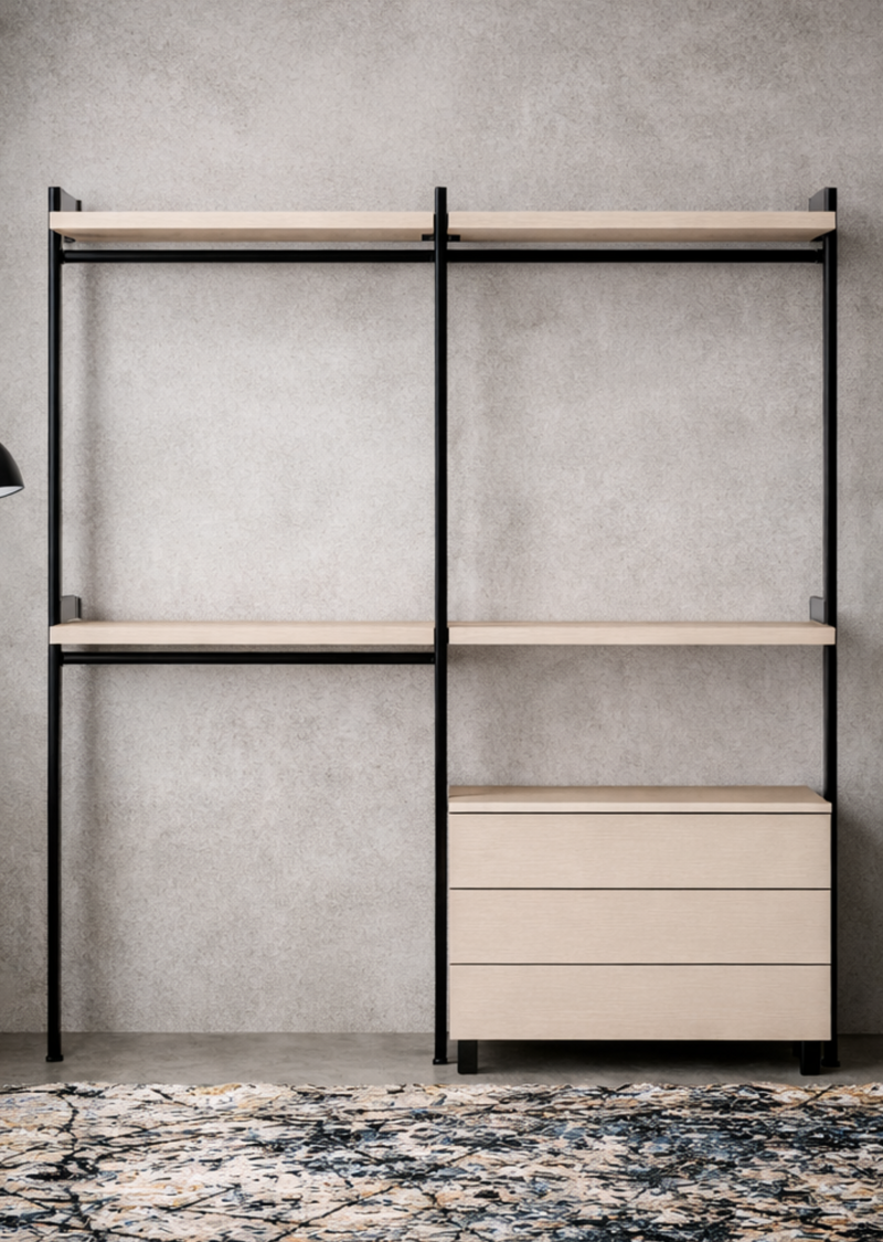 Scalo è un armadio a vista con struttura in finitura brunito, ideale per ambienti dallo stile urban e industrial. Dotato di cassettiera a 3 cassetti, unisce praticità e carattere. Disponibile in due colori.