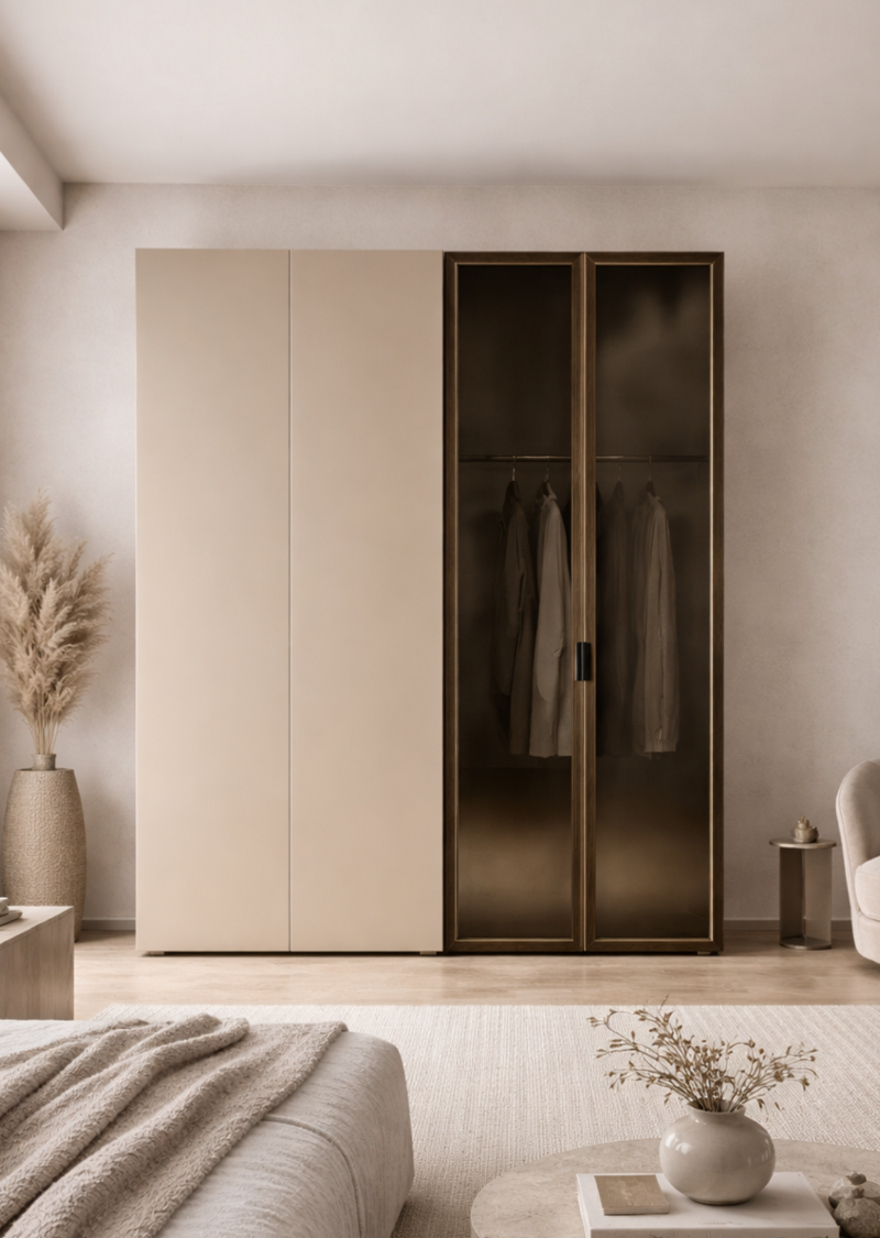 Skyline è un armadio a 4 o 6 ante con frontali in vetro fumé, dal forte impatto visivo. Completo di cassettiera interna a 3 cassetti, è perfetto per interni moderni e luminosi. Disponibile in due varianti cromatiche.