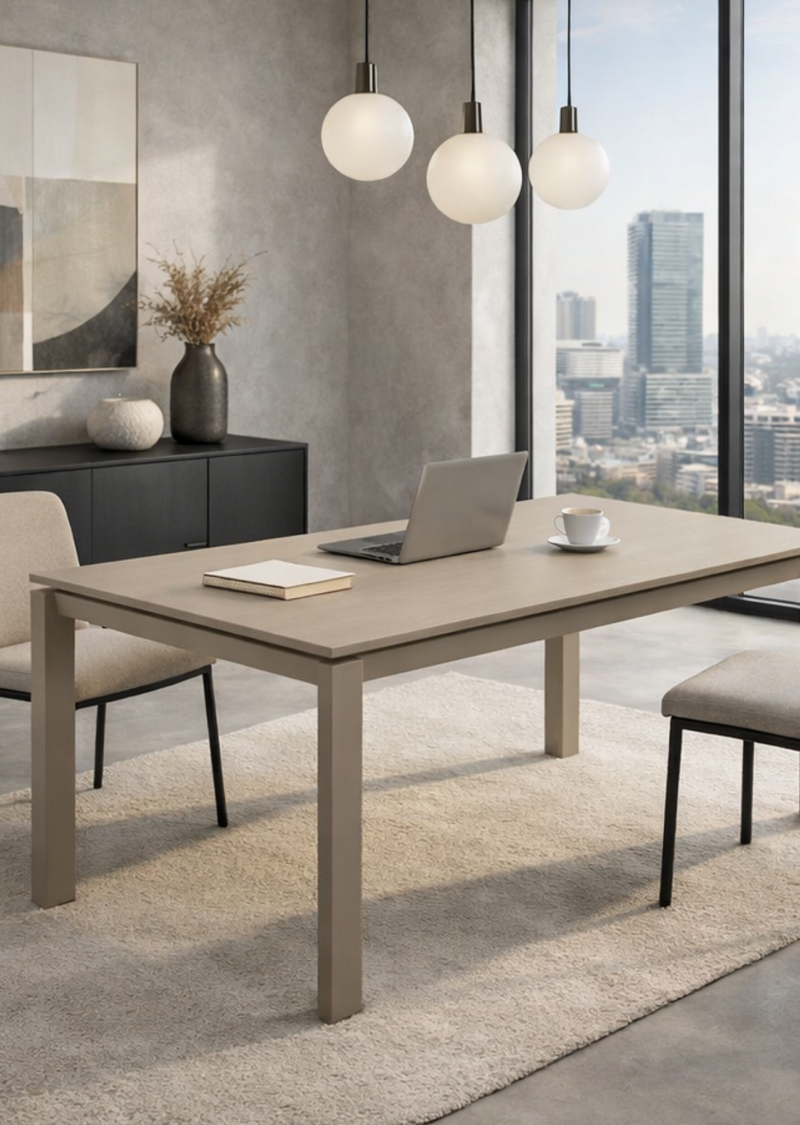 Linee pulite e finitura sabbia per un tavolo moderno e discreto. Allungabile fino a 220 cm, unisce praticità e leggerezza visiva, ideale per ambienti minimali dallo stile elegante.